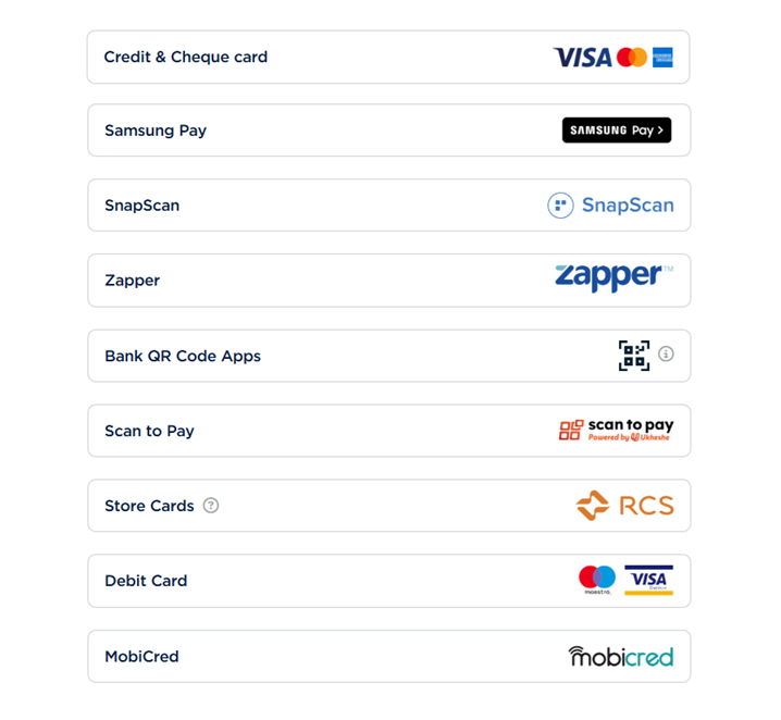 Rock Solid Music offers the following payment options via PayFast.