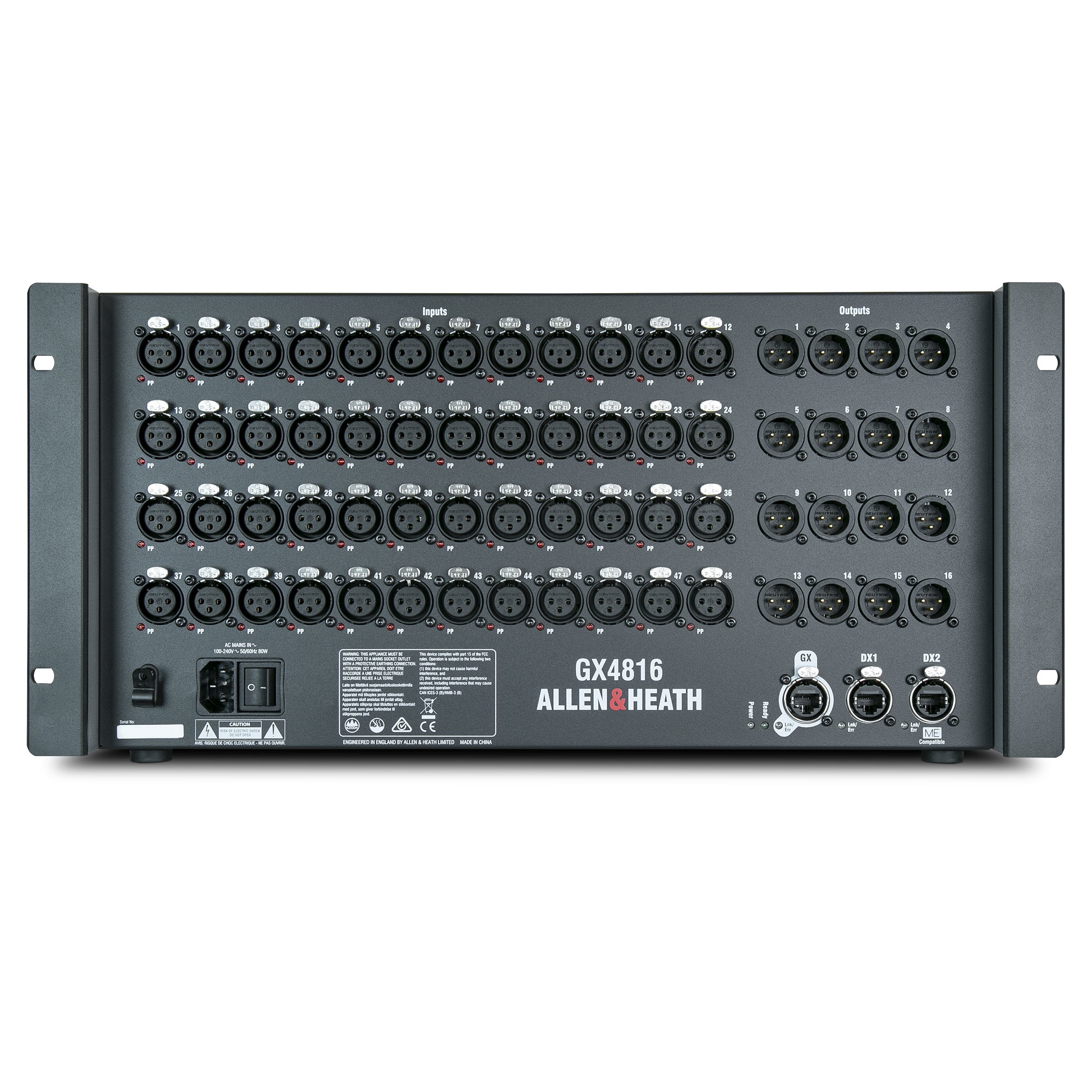 Each GX4816 is loaded with 48 dLive mic preamps with independent Phantom Power LED indicators, plus 16 XLR line outputs. Additionally, 2 DX ports are provided for connection to up to 4 DX Expanders for further I/O expansion. Connection to a ME Personal Mixing System is possible via the DX2 socket when used with SQ or Avantis.