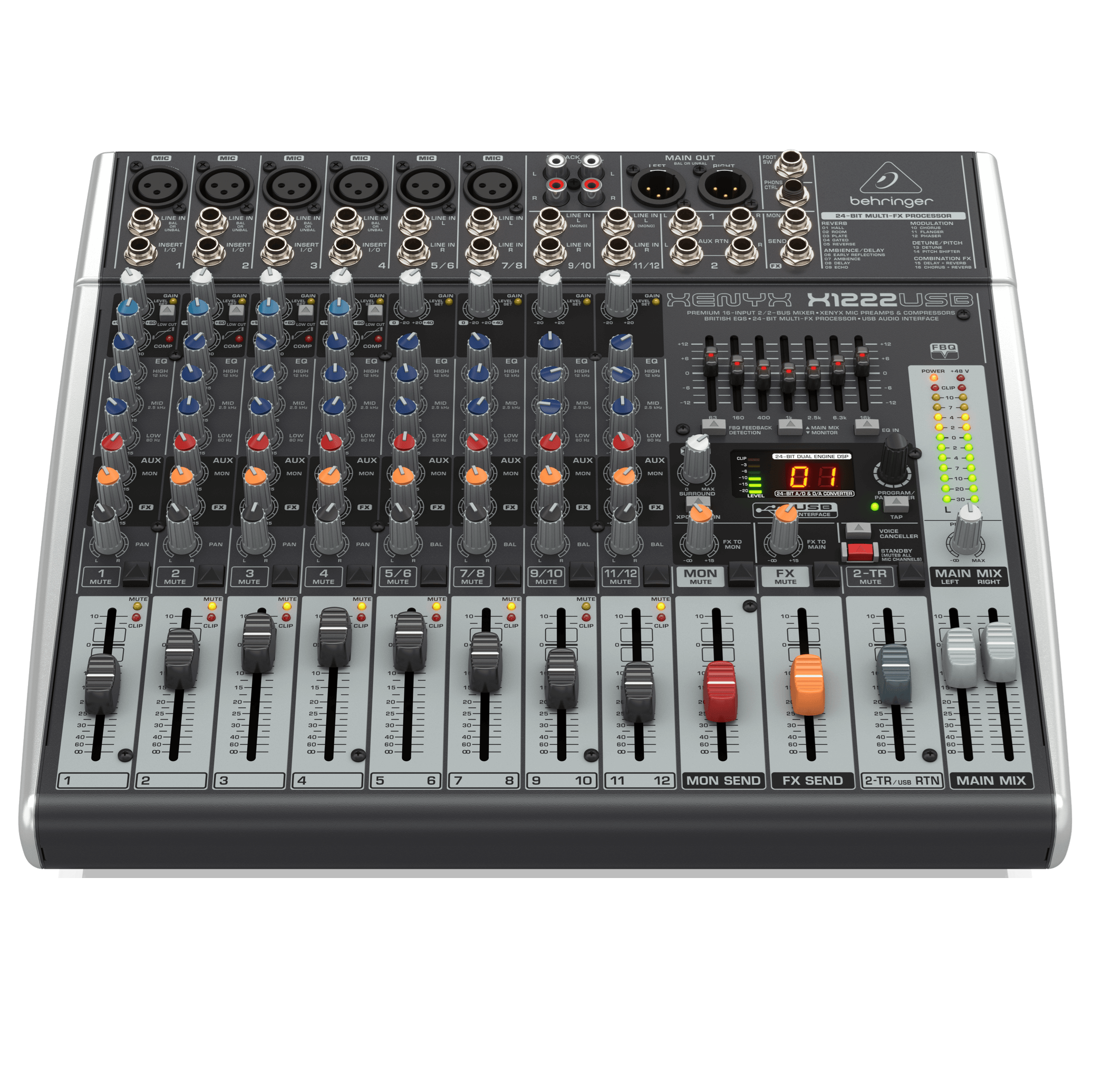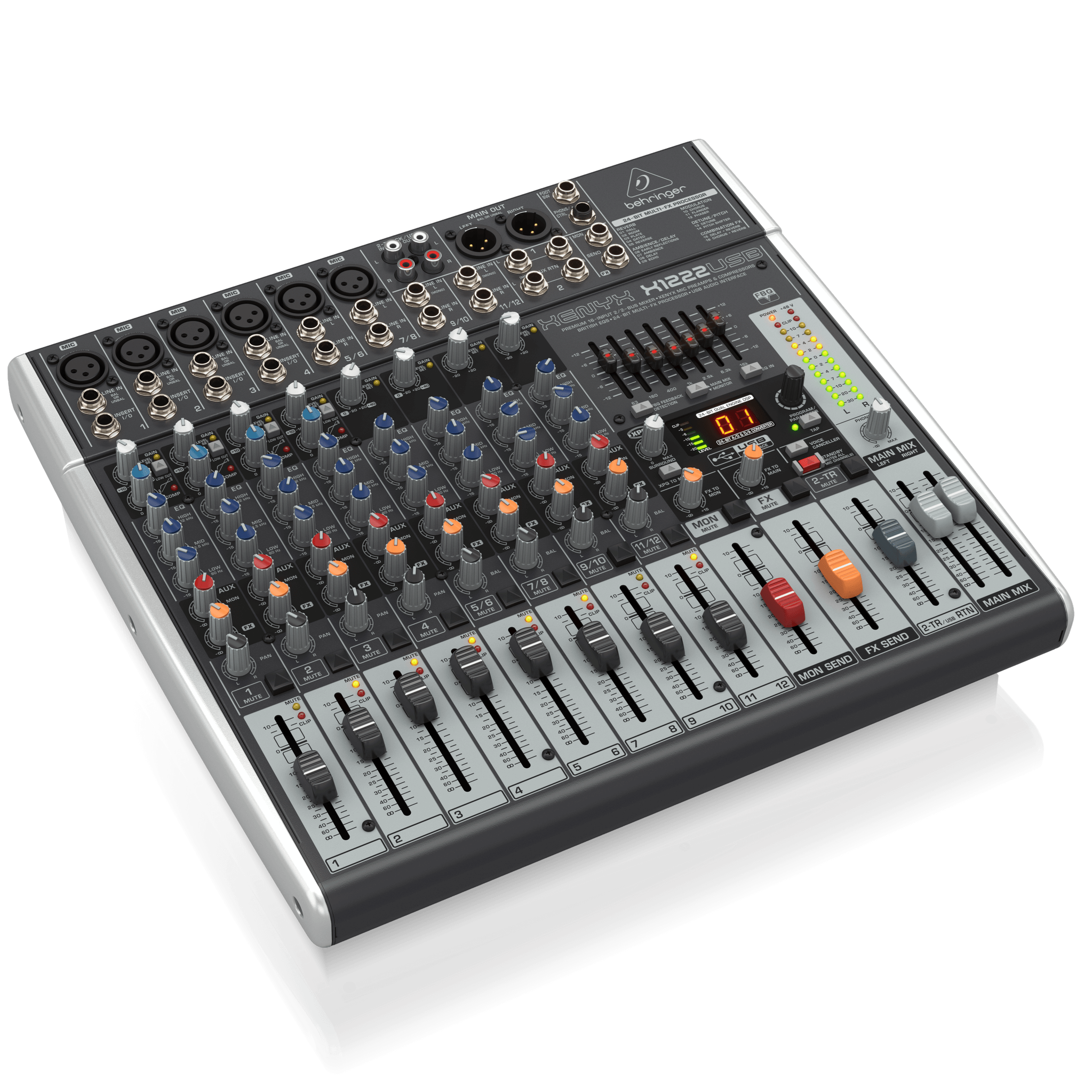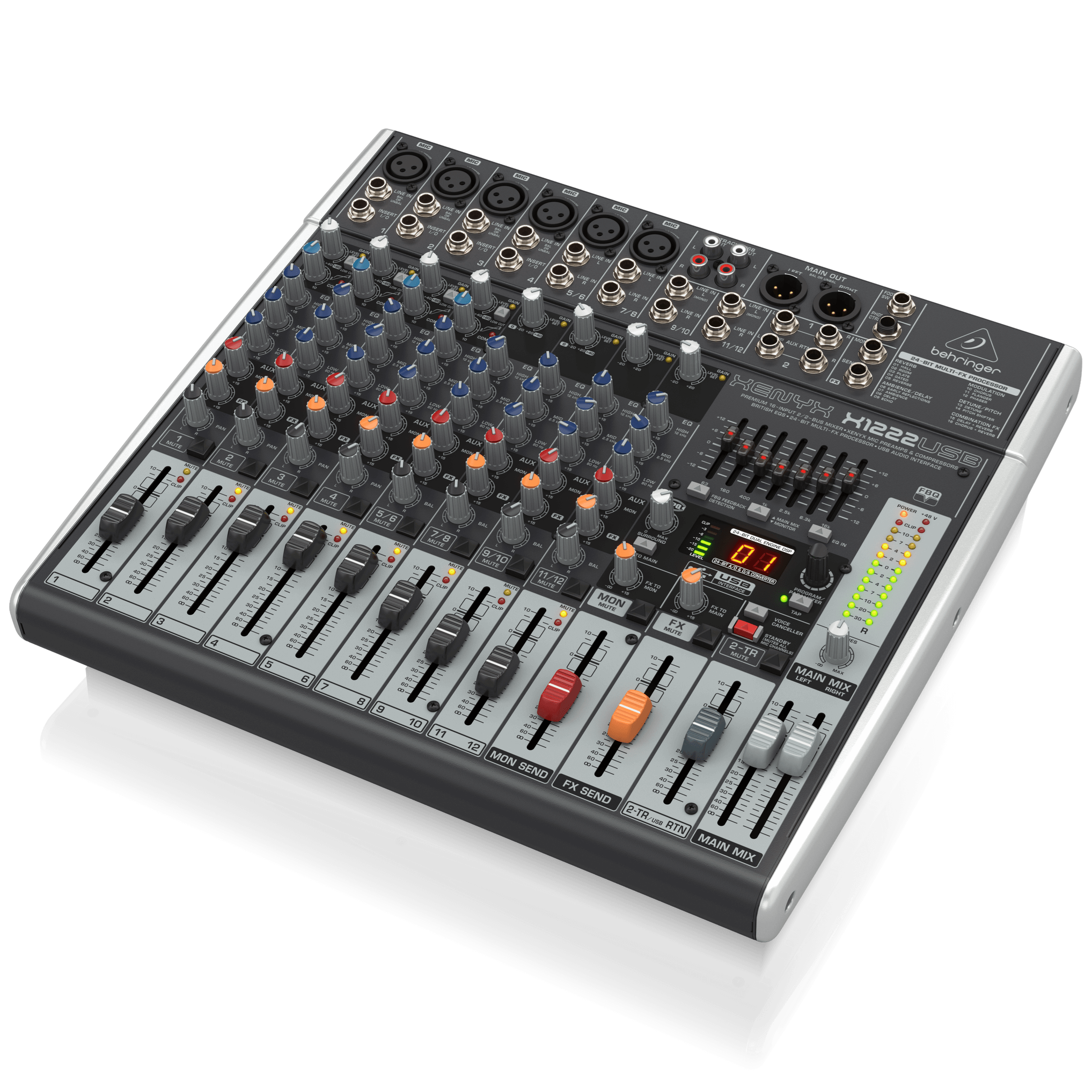 The compact XENYX X1222USB mixer allows you to effortlessly achieve premium-quality sound. Channels 1 – 4 feature our XENYX Mic Preamps, renowned for their pristine performance, plus 2 of the 4 stereo channels accept XLR inputs, as well as Line-Level sources. All mono channels get our ultra-musical “British” 3-band EQs and easyto- use “one-knob” compressors for the ultimate in punch and clarity. Add to this our 24-bit, dual engine Multi-FX processor with 16 editable, professional-grade presets that include reverb, chorus, flanger, delay, pitch shifter and multi-effects – and the X1222USB becomes an incredibly versatile mixer for your live performances.