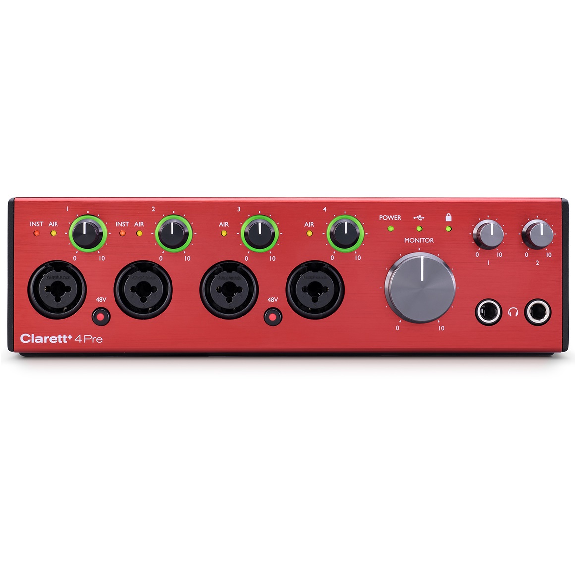 FOUR HIGH-PERFORMANCE CLARETT⁺ PREAMPS : Hear every nuance and capture clear and powerful audio with preamps that bring masses of headroom, low distortion and ultra-low noise.