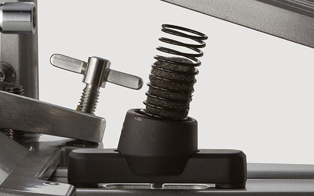 The conventional approach to the spring assembly (including previous Iron Cobra Pedals) has been to anchor the bottom of the spring while the top of the spring is being pulled from various angles throughout the pedal’s cycle. But a spring being pulled on at an angle represents wasted energy and causes turbulence. The Swivel Spring Tight assembly solves this problem, recapturing that lost energy and optimizing smoothness through the use of a contoured assembly that allows the base to swivel freely with the spring. This enables a straight spring pull during the pedal’s entire cycle, resulting in the smoothest, lightest action ever found on a bass drum pedal.