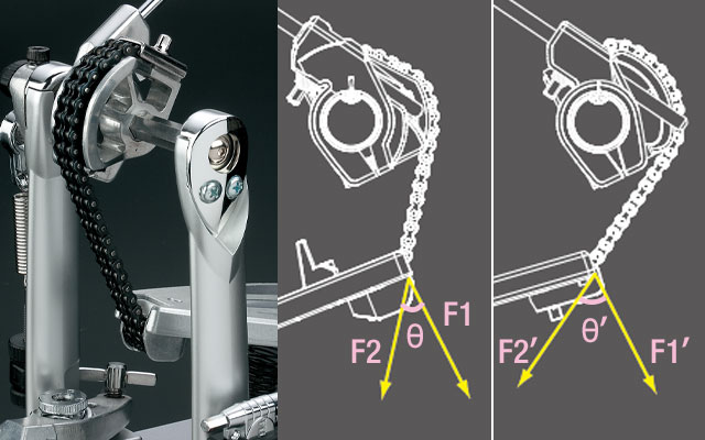 To continuously play fast passages, your pedal action has to feel light for less stress and muscle fatigue. The Recessed Setting position makes it possible to achieve a perfect balance between the natural playing feel of the Chain Drive’s motion and lighter action. According to physical theorem, wider angle (θ) between the force of stepping on the footboard (F1) and the force of pulling the chain from the sprocket (F2) makes less power of F1 if the same F2 power is required. To utilize this theorem, we set up the footboard placement with the best balance between natural action and lighter motion. Also by changing the bearing’s framework structure, this produces less stress on the FASTBALL bearing and makes a huge difference in the total feel. As a result, about 20% less exertion is required to produce the same result in power and feel found in existing current models.